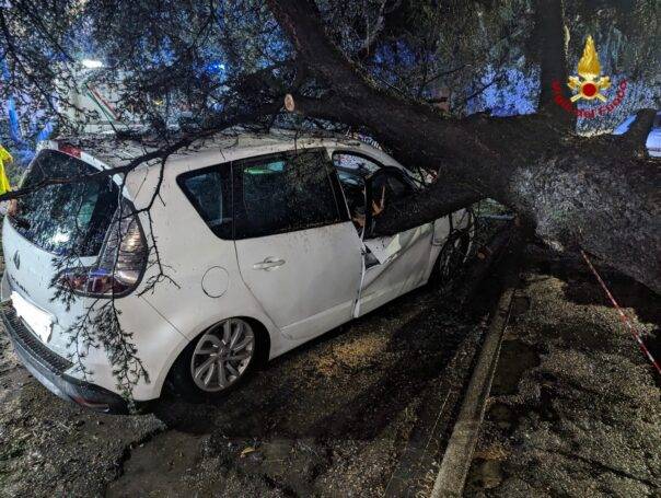 Il grosso pino, al momento della caduta ha travolto un’autovettura il cui occupante è uscito fortunatamente illeso ma sotto shock per lo scampato pericolo.