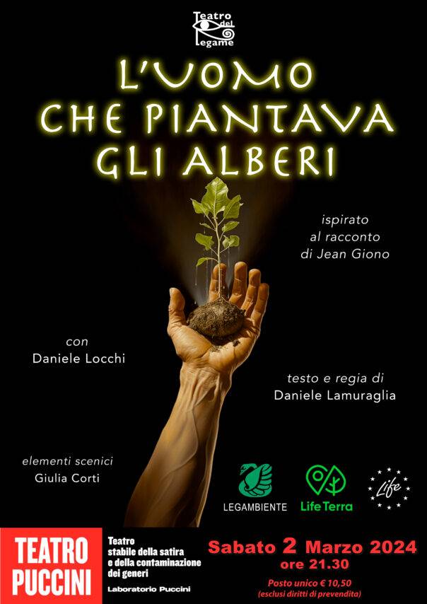 L’uomo che piantava gli alberi da Jean Giono, testo e regia Daniele Lamuraglia, con Daniele Locchi; elementi scenici Giulia Corti, è ispirato a un racconto di uno scrittore pacifista e ambientalista; un’emozionante alternanza e intreccio di forma narrativa e poetica quei valori di profondo rispetto nei confronti della Natura che lo possono rendere un punto di riferimento per affrontare le urgenti tematiche ecologiste dei nostri tempi. La storia è quella di un Camminatore che si inoltra sulle Alpi francesi e finisce in una vallata deserta e arida, dove della civiltà umana rimangono solo degli inquietanti resti di un villaggio abbandonato. Incontra quindi inaspettatamente un Pastore col suo gregge, un uomo sui 55 anni piuttosto silenzioso che gli offre l’ospitalità. Un po’ alla volta il camminatore scoprirà quali siano state le durissime vicende personali di quell’uomo solitario e quale sia il modo col quale ha deciso di reagire: seminare piante, far crescere alberi, sapendo che egli stesso non riuscirà mai a vedere il risultato finale di quell’opera, che ci verrà descritta solo dal meravigliato resoconto conclusivo del Camminatore.