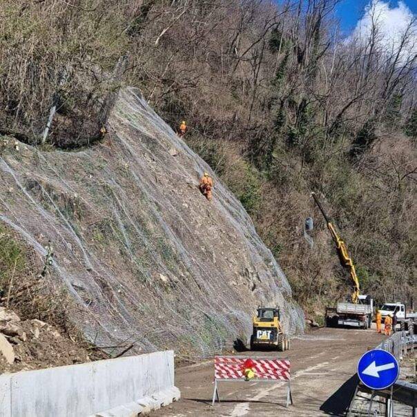 Gli interventi, avviati da Anas immediatamente dopo l’evento, hanno riguardato una prima fase di messa in sicurezza provvisoria tramite bonifica del versante da tutto il materiale in frana e posa in opera di una rete corticale da 1.200 metri quadrati con 260 chiodature per il consolidamento del versante, attività che hanno richiesto l’impiego di rocciatori specializzati.