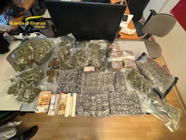 FIRENZE – Operazione della Guardia di Finanza di Firenze in zona Novoli: fermata un’auto con a bordo due ragazzi italiani. All’interno della macchina c’era un cartone contente circa 1,7 chilogrammi di marijuana suddivisa in 14 bustine di cellophane termosaldate. La perquisizione è proseguita nelle abitazioni dei giovani: dove sono stati trovati 8,2 chilogrammi di hashish, ulteriori 1,1 kg di marijuana, 300g di cocaina, 6g di Ketamina, 4 bilancini di precisione. C’erano anche denaro contante per un valore di 16.650,00 euro; una bomba carta artigianale; un taser da 98.000 Volt e 13.000 euro suddivisi in banconote risultate false.