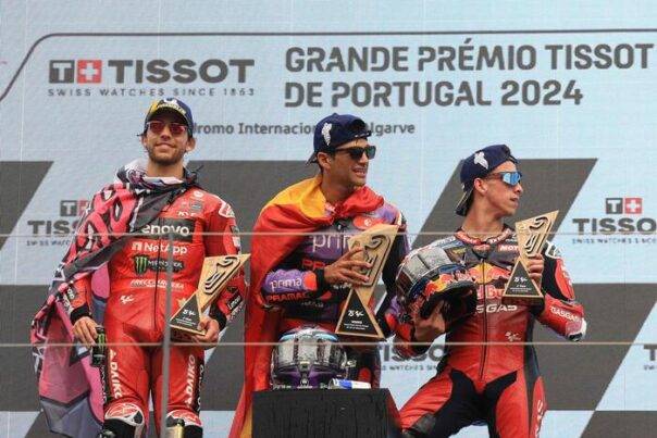 PORTIMAO (PORTOGALLO) – Jorge Martin vince il Gran Premio del Portogallo, in 41’18″138 e conquista anche il primato nel mondiale, approfittando della caduta di Bagnaia (distante 23 punti). Il pilota madrileno è riuscito a guadagnare sin dalla partenza la testa della corsa, gestendo il distacco da Vinales e Bastianini, per poi, nel finale, imporre l’allungo definitivo e tagliare il traguardo sotto la bandiera a scacchi sventolata da Josè Mourinho.