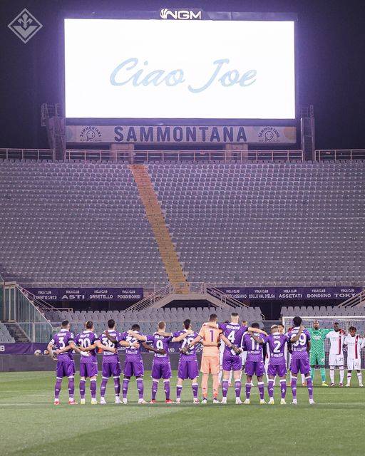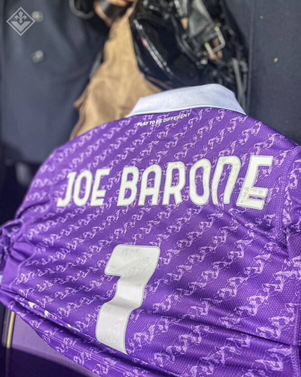 BARONE – Ricordo di Joe Barone: striscioni e video. Applausi. E minuto di raccoglimento. Maglia viola e mazzo di rose sulla poltrona che era occupata dal Direttore.