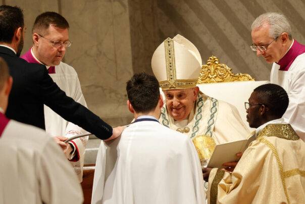 La liturgia del Sabato Santo, in cui si celebra la Risurrezione di Cristo, stasera prevedeva anche che si impartissero i sacramenti dell’iniziazione cristiana – battesimo, cresima e prima comunione – a otto catecumeni adulti: quattro italiani, due coreani, un giapponese e una albanese. E Francesco – giunto in sedia a rotelle e poi assiso sulla poltrona davanti all’Altare della Confessione (che è sovrastato dalle impalcature per il restauro del Baldacchino) – sembra aver retto bene alla lunghezza e alla complessità del rito.