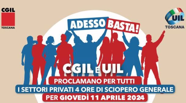 In occasione dello sciopero, oltre a varie iniziative nei territori della regione elencate sul sito https://cgiltoscana.it/2024/04/02/11-aprile-sciopero-cgil-uil-le-iniziative-in-toscana/, a Firenze è prevista l’assemblea generale di Cgil Toscana e di Uil Toscana presso l’Auditorium al Duomo in via de’ Cerretani 54/r, ore 9:30-13, con apertura di Paolo Fantappiè (Segretario generale Uil Toscana), interventi di delegate e delegati, conclusioni di Rossano Rossi (Segretario generale Cgil Toscana).