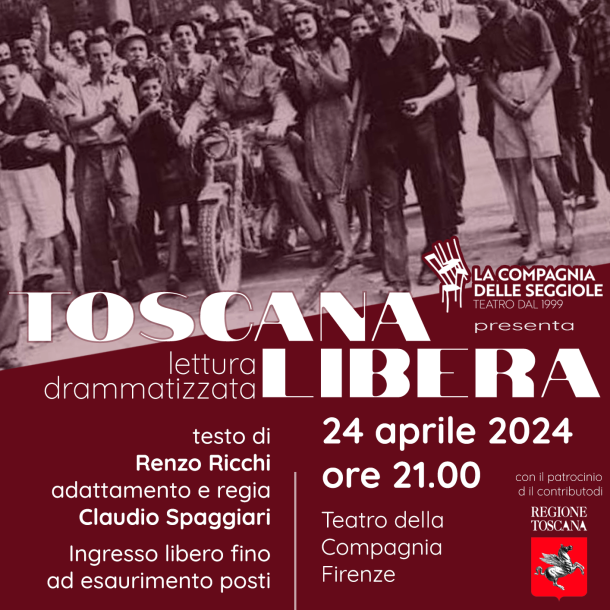 FIRENZE – Mercoledì 24 aprile alle 21, nell’ambito delle celebrazioni del 25 aprile, al Teatro della Compagnia (via Cavour 50r, Firenze) va in scena Toscana libera, lettura drammatizzata a cura della Compagnia delle Seggiole su testo di Renzo Ricchi; l’ingresso è libero fino ad esaurimento dei posti.