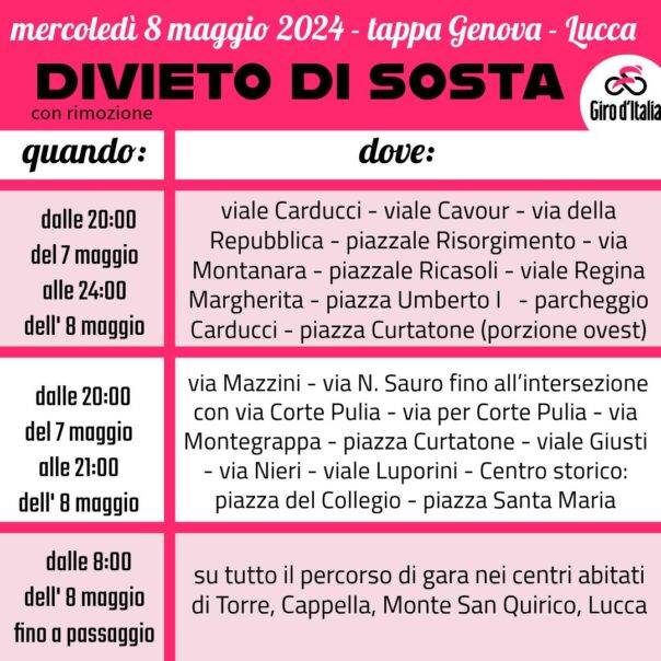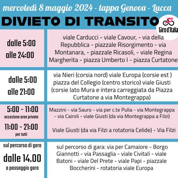 Divieti nelle aree limitrofe all’area di arrivo – Nella giornata dell’8 maggio, fra le ore 5.00 e le ore 21.00, resterà aperta al traffico la solo corsia ovest del cavalcavia di viale Europa, sarà quindi consentito il transito del traffico da Sant’Anna, piazzale Italia, via Nieri, viale Europa solo in direzione sud. Per fare il tragitto contrario sarà necessario utilizzare la variante di San Donato e il cavalcavia di viale Città Gemelle. Traffico pesante deviato sul casello autostradale di Capannori. In viale Giusti e traverse divieto di transito dalle 5.00 (ore 11 per aree private) alle ore 21 di mercoledì 8.