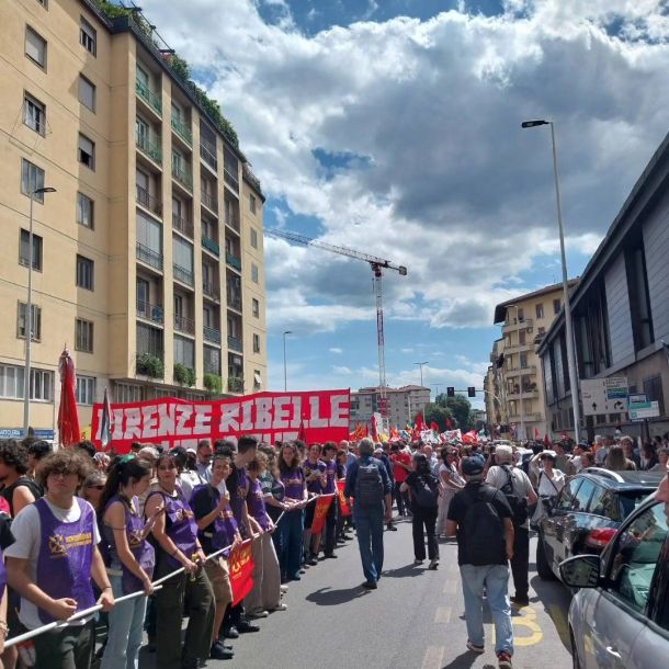 FIRENZE – Hanno sfilato oltre tremila persone in corteo per le vie di Firenze, per la manifestazione organizzata oggi, 18 maggio 2024, dal Collettivo di fabbrica della ex Gkn di Campi Bisenzio. I manifestanti, con bandiere, striscioni, tamburi e fumogeni, sono partiti da via Mariti, di fronte al cantiere teatro della strage del 16 febbraio scorso, e si sono diretti in via di Novoli, dove la manifestazione si è conclusa con un presidio di fronte ai palazzi degli uffici della Regione Toscana.
