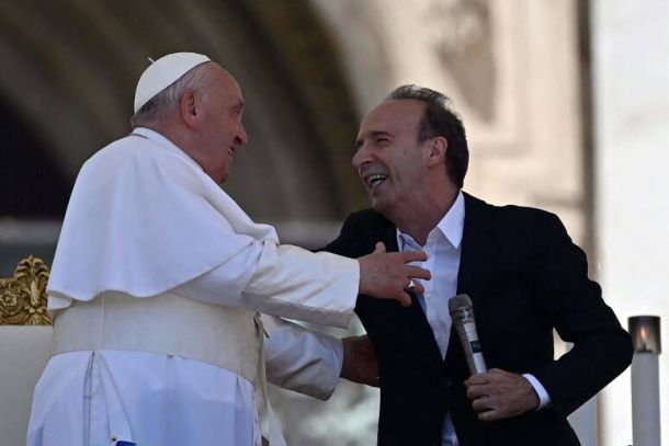 Benigni con il Papa e i bambini: “Non abbiate paura di sbagliare. Gli errori sono utili: pensate alla Torre di Pisa”