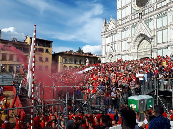 FATTORI EROICO – E siamo alla caccia-capolavoro di Marcello, da metà campo, la “caccia alla Lapi”. L caccia del 7-3. E’ il 41′. Ma qui arrivano le espulsioni, pesantissime, per gli Azzurri. E salgono in cattedra due bravissimi calcianti rossi: Gianassi e Leonardo Fattori, una sorta di Enrico Toti: zoppicante ma bravo ad andare in caccia due volte. E’ lui che ridà spinta ai Rossi. Li porta sul 7-5. E Cecconi poi sul 7-6 al 47′. Arriva il pareggio con Matteo Manuel (se ho capito bene il nome) al 49′. Il cinquantesimo minuto trova Azzurri e Rossi alla pari. Ed è qui che, dopo un paio di minuti di “supplementare”, arriva la caccia d’oro: lancio da metà campo di un rosso, lasfiorano in tre, Davide Ceccherelli cerca invano di salvare la sua rete, ma sfiora appena la palla che, beffarda come in un film con finale thrilling, rimbalza ancora e finisce, precisa e imprendibile nella rete. Vincono i Rossi. Campioni per il secondo anno consecutivo. Ma onore agli Azzurri. Evviva Fiorenza!
