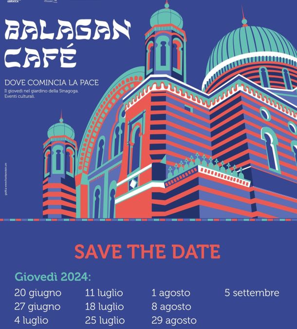 FIRENZE – «Dove comincia la Pace» è il sottotitolo dell’edizione 2024 di «Balagan Cafè», la rassegna nel giardino della Sinagoga di Firenze (via Farini 6): dal 20 giugno al 5 settembre 10 giovedì con concerti ed eventi gratuiti e, per chi lo desidera, un aperitivo-cena a pagamento (solo su prenotazione via mail a saperiesapori2024@gmail.com; posti limitati, cucina prevalentemente ebraica).