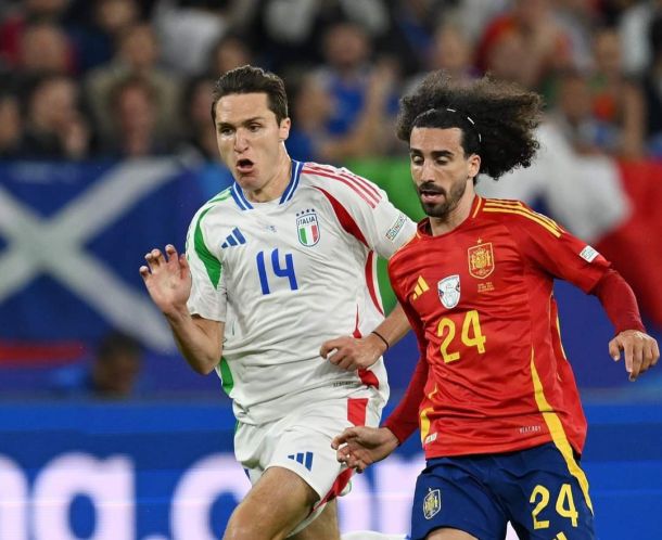 CHIESA – Al 37′ la Spagna tenta uno schema da palla inattiva: passaggio distante dalla porta per Fabian che stoppa e calcia, ma tira abbondantemente alto. Al 41′ altro tentativo di Fabian con Donnarumma bravo a bloccare il tiro. Al 45′ con pochi passaggi l’Italia si presenta finalmente in avanti, ma Chiesa decide di andare personalmente e calcia col destro da posizione defilata: palla fuori dallo specchio. Dopo due minuti di recupero termina un primo tempo nel quale la superiorità della Spagna è stata evidente. Gli azzurri si presentano nella ripresa con Cristante e Cambiaso al posto di Jorginho e Frattesi e dopo pochi secondi il romanista si becca un cartellino giallo per un duro intervento su Rodri.