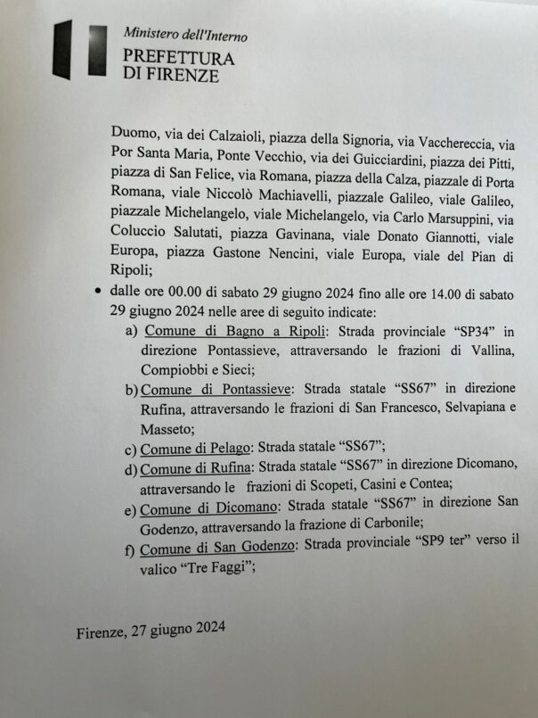 Il divieto è valido dalla mezzanotte di sabato 29 giugno 2024 e fino alle ore 13 dello stesso giorno nel Comune di Firenze, nel piazzale delle Cascine, viale degli Olmi, piazzale Thomas Jefferson, viale del Visarno, via del Fosso Macinante, via Luciano Berio, piazza Vittorio Veneto, viale Fratelli Rosselli, piazzale di Porta al Prato, via il Prato, via Curtatone, lungarno Amerigo Vespucci, piazza Carlo Goldoni I, via della Vigna Nuova, piazza di San Giovanni, piazza del Duomo, via dei Calzaioli, piazza della Signoria, via Vacchereccia, via Por Santa Maria, Ponte Vecchio, via dei Guicciardini, piazza dei Pitti, piazza di San Felice, via Romana, piazza della Calza, piazzale di Porta Romana, viale Niccolò Machiavelli, piazzale Galileo, viale Galileo, piazzale Michelangelo, viale Michelangelo, via Carlo Marsuppini, via Coluccio Salutati, piazza Gavinana, viale Donato Giannotti, viale Europa, piazza Gastone Nencini, viale Europa, viale del Pian di Ripoli.