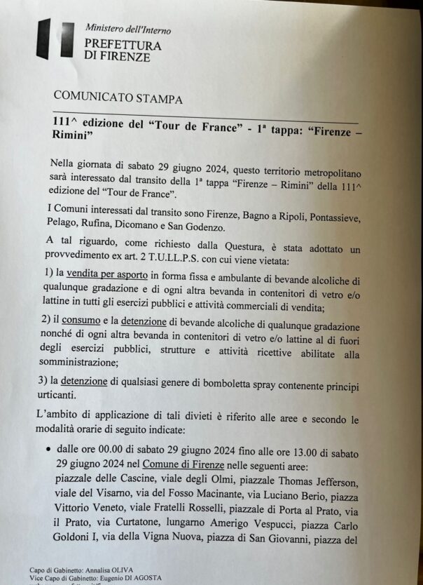 La vendita per asporto in forma fissa e ambulante di bevande alcoliche di qualunque gradazione e di ogni altra bevanda in contenitori di vetro e/o lattine in tutti gli esercizi pubblici e attività commerciali di vendita; il consumo e la detenzione di bevande alcoliche di qualunque gradazione nonché di ogni altra bevanda in contenitori di vetro e/o lattine al di fuori degli esercizi pubblici, strutture e attività ricettive abilitate alla somministrazione; la detenzione di qualsiasi genere di bomboletta spray contenente principi urticanti sono state vietate dalla prefettura di Firenze, come richiesto dalla questura, adottando un provvedimento ex art. 2 Tullps, per sabato 29 giugno 2024, in occasione del transito della 17/a tappa ‘Firenze – Rimini’ della 111/a edizione del Tour de France.
