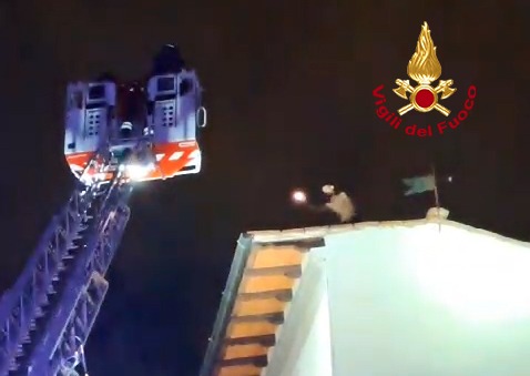 I Vigili del fuoco per mezzo dell’autoscala, hanno fatto salire sul cestello due agenti ed insieme hanno raggiunto l’uomo e recuperato dal tetto.