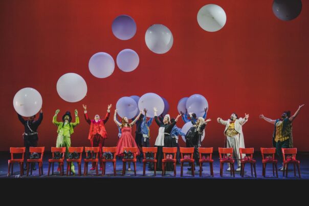 Un Barbiere frizzante che inizia come un viaggio in treno da Firenze a Siviglia (magari si potesse fare!), annunciato dall’altoparlante: un modo allegro di viaggiare “attraverso” l’opera di Rossini, richiamando i luoghi e le situazioni con la fantasia. Costumi evocativi e bizzarri e colori accesi sanno ai personaggi un aspetto caricaturale, quasi fossero personaggi della Commedia dell’Arte: Don Basilio è verdissimo con capelli lunghi, unti, naso adunco, tutto verde d’invidia come un serpente (o meglio, un basilisco); Figaro ha capelli che alludono a orecchie volpine e baffi, mentre don Bartolo, tutto in bianco, assomiglia a un panciuto bulldog che guarda geloso Rosina, vestita di rosso (colore dell’amore) come Lindoro.