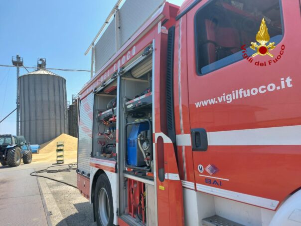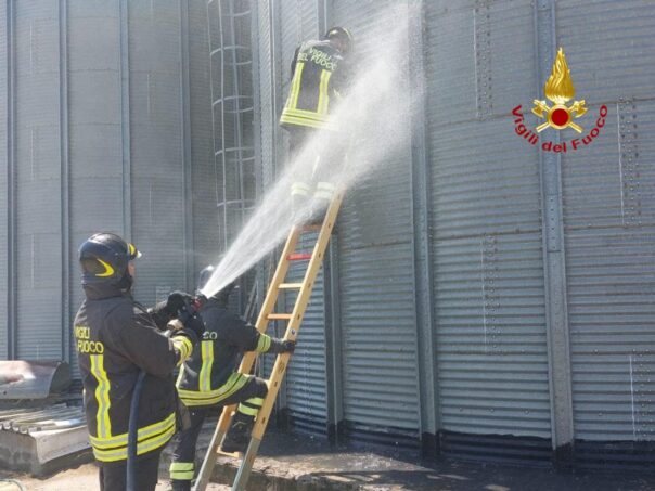 Per cause da verificare, la struttura cilindrica del manufatto ha subito una lesione trasversale a circa metà della sua altezza e la squadra VF, per scongiurare il pericolo di collasso della struttura metallica, sta effettuando e monitorando le operazioni di svuotamento del grano contenuto nel deposito. Sul posto anche il funzionario vigili del fuoco di servizio.