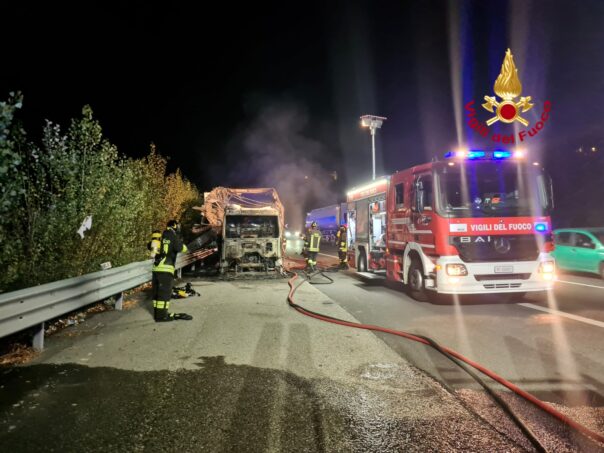 Disposta la chiusura di una corsia per consentire di effettuare le operazioni di spegnimento in sicurezza per gli operatori vigilfuoco. Intervento terminato alle ore 3:00.
