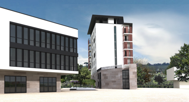Il progetto prevede la realizzazione di due edifici, il primo a torre (edificio A) e il secondo in linea (edificio B), destinati a ospitare gli alloggi per gli studenti e gli spazi comuni di socializzazione, con la demolizione degli edifici attualmente presenti nell’area. L’edificio A si svilupperà su otto piani, con servizi collettivi al piano terra e al primo piano e aree giorno/cucina ai piani superiori, dove sono collocate le camere singole, doppie e i minialloggi, ciascuno dotato di servizi igienici; l’edificio B si svilupperà invece su tre piani, con al primo e secondo piano le camere singole e doppie e i servizi collettivi concentrati al piano terra. I minialloggi saranno dotati di soggiorno con cucina privata; per le camere singole e doppie sono invece previste cucine collettive attrezzate. Ogni cucina sarà corredata di spazi per il relax e la socializzazione. La sala giochi è pensata per trascorrere momenti di svago nel tempo libero con attrezzature come tavoli da ping pong e tavoli da calcetto.