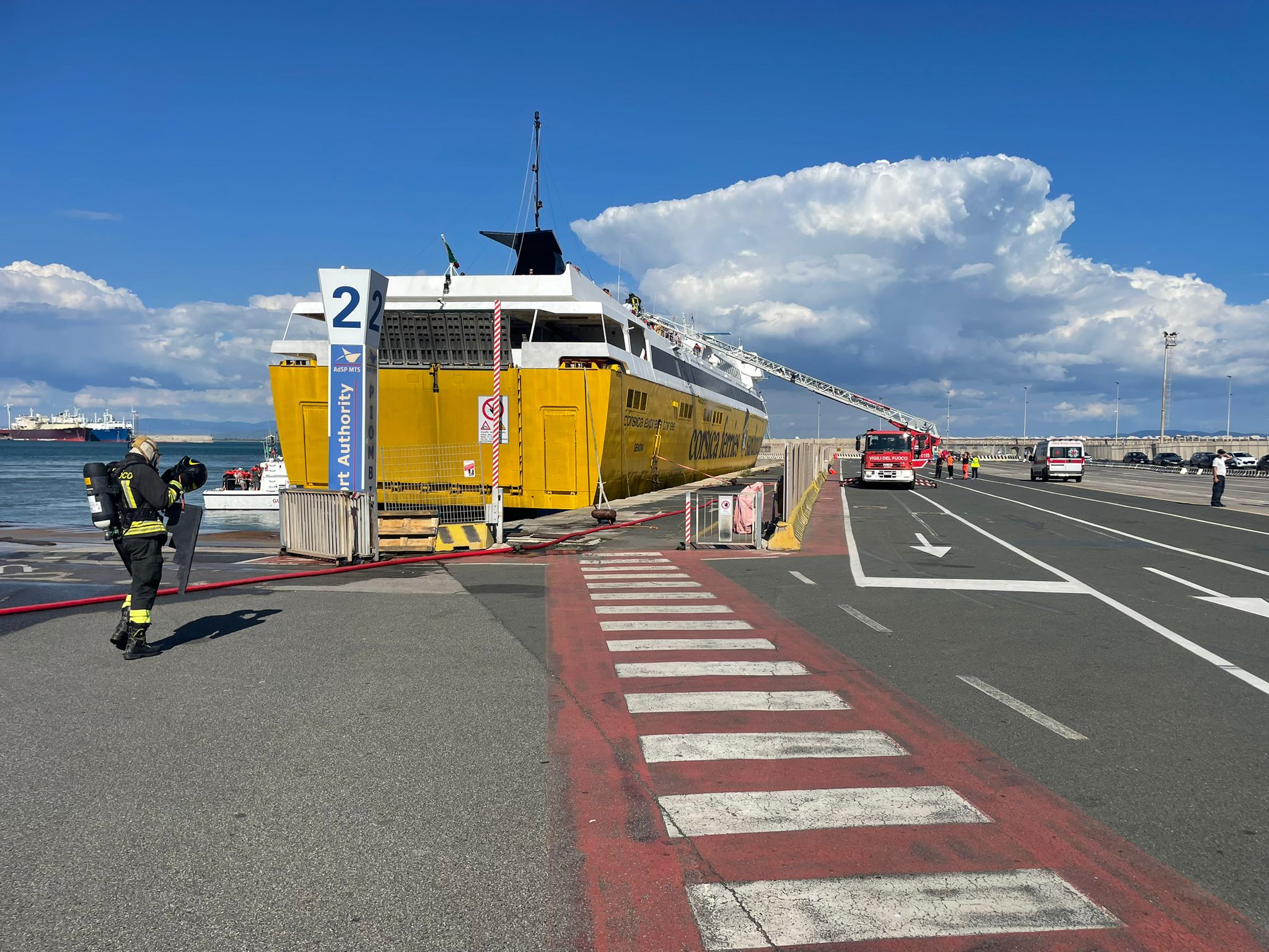 Al momento sono in corso le operazioni di evacuazione delle circa 300 persone a bordo, tra passeggeri e personale della compagnia di navigazione. I Vigili del fuoco sono sul posto con 3 squadre, 3 autoscale, 2 carri aria, personale dei nuclei sommozzatori di Livorno e Grosseto e con l’elicottero Drago del reparto volo VF di Cecina.