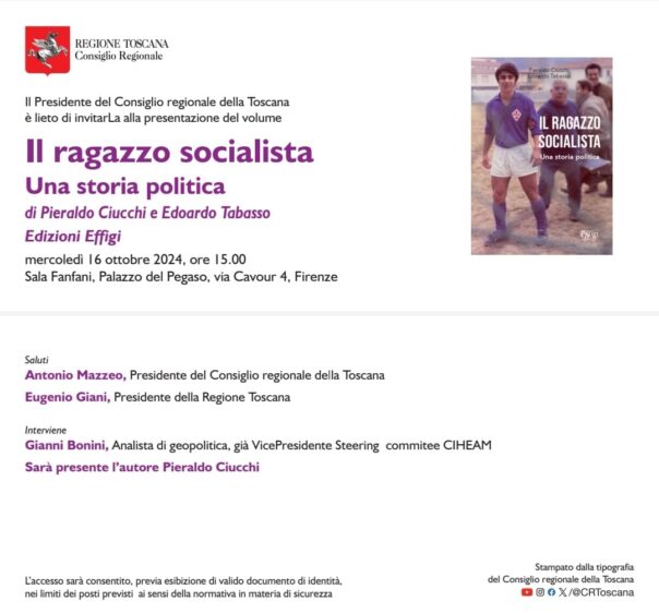 Presentazione oggi, 16 ottobre 2024, nella Sala Fabiani del Consiglio Regionale della Toscana, in via Cavour 2. Interverranno Eugenio Giani, Antonio Mazzeo, Gianni Bonini.