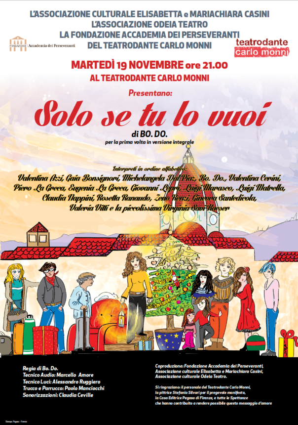 “Solo se tu lo vuoi”, opera scritta da , madre di Maria Chiara ed Elisabetta Casini, in memoria delle figlie e delle vittime del tragico incidente del 14 novembre 2004 (una notte con una tempesta di vento di rara intensità, ma la causa dell’incidente fu lo scontro con una Smart biposto in cui viaggiavano, a forte velocità, tre ragazzi, due dei quali pure deceduti): sarà questo lo spettacolo che andrà in scena martedì 19 novembre ore 21 al Teatrodante Carlo Monni, in occasione del ventesimo anniversario della scomparsa delle due giovani, uno degli incidenti più gravi mai avvenuti a Firenze che colpì l’intera comunità fiorentina, lasciando un segno profondo a Coverciano e nella famiglia Casini. La serata sarà un’occasione per tutta la comunità di ricordare Maria Chiara ed Elisabetta, ma anche per riflettere insieme sull’importanza della sicurezza stradale e sul significato del ricordo come strumento di sensibilizzazione: secondo i dati forniti dall’Asaps, l’Associazione amici della polizia stradale, al 10 novembre di quest’anno le vittime di incidenti stradali sono già 1254, confermandoli come la principale causa di morte tra i bambini e i giovani adulti di età compresa tra 5 e 29 anni.