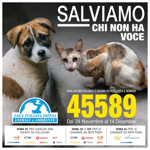 ROMA – La Leeida, Lega Italiana per la Difesa degli Animali e dell’Ambiente, lancia per Natale la campagna “Salviamo chi non ha voce, gli animali”. Da domenica 24 novembre a sabato 14 dicembre 2024 sarà possibile contribuire anche a salvarli e a proteggerli donando 2 euro con un sms al numero 45589 o 5/10 euro chiamando da rete fissa. Un piccolo gesto può fare molto: non guardare dall’altra parte, aiutali.