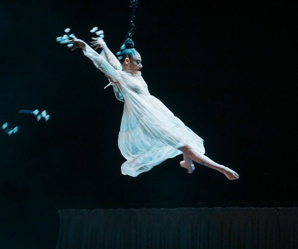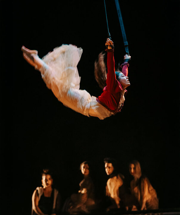 Alla musica tratta dalle cinque opere più famose di Puccini (con una sorta di preludio che accenna agli esordi del compositore, con due piccoli estratti da Le Villi), eseguita dall’Orchestra della Toscana (ORT) diretta da Gianna Fratta, si accosta e a tratti si fonde l’elettronica di Beatrice Zanin, mentre sul palco recita un attore (Giacomo Puccini) attorniato dalle sue eroine, Manon Lescaut, Mimì (Bohème), Tosca, Madama Butterfly e Turandot, che si confondono un po’ anche con le donne della sua vita. A impersonarle delle bravissime danzatrici-acrobate della Compagnia BluCinque (fantastica, per leggerezza e bellezza dei movimenti, la Butterfly che si libra nell’aria appesa per lo Chignon). Lo spettacolo è adatto anche a un pubblico molto giovane (presenti molti bambini e ragazzini in sala, disciplinatissimi), ma se ne capisce appieno il senso soltanto se si conoscono bene le opere di Puccini e anche la biografia e le lettere – solo così si coglie la connessione operata fra il suicidio dell’immaginaria Tosca e quello della povera realissima Doria Manfredi). Una bella costruzione, che, come si legge nel libretto di sala, “si struttura in coreografie aeree e terrene e scorci di testo e immagini frammentate e oniriche”.