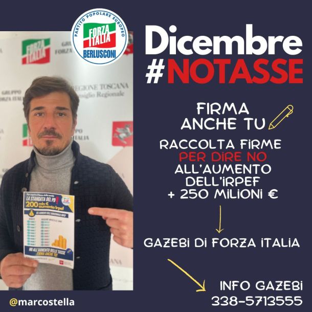 “Inizia una mobilitazione importante per chiedere a Giani di mantenere gli impegni – spiega il segretario regionale di Forza Italia Toscana, Marco Stella –. I politici vanno giudicati per ciò che dicono, ma soprattutto per le azioni che seguono alle loro promesse. Non possiamo accettare che questo aumento diventi strutturale”.