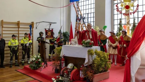 Il corteo con il gonfalone del comune di Firenze, la Guardia del Fuoco, il personale operativo e quello dell’Associazione Nazionale Vigili del Fuoco, ha percorso il piazzale per fare ingresso nella palestra allestita dove è stata celebrata la santa messa officiata da monsignor Marco Viola e il cappellano padre Alessandro Lombardi.