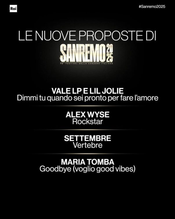 Ecco chi sono i 4 artisti che entrano ufficialmente a far parte del cast di Sanremo 2025. Il duo Vale Lp e Lil Jolie (con il brano Dimmi tu quando sei pronto per fare l’amore), Alex Wyse (con Rockstar), Settembre (con Vertebre) e Maria Tomba con Goodbye (voglio good vibes), i primi dalle selezioni di Sanremo Giovani, l’ultima da Area Sanremo.