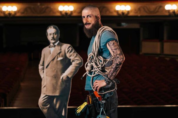 Un’orchestra è un organismo vivente, composto da tanti elementi: musicisti, cantanti, direttori, compositori. Tante parti, più o meno vistose, senza la presenza di ciascuna delle quali non si può fare spettacolo. E Giacomo lo sa, che senza le sue braccia muscolose da esperto macchinista, non sarebbe possibile sistemare il palco, posizionare fari, controllare ogni dettaglio sulla sicurezza. Lui sa di essere fondamentale. Come la musica che l’orchestra suona. Come il compositore che l’ha creata. Ma forse anche qualcosina di più. Mentre un ensemble di musicisti sta provando sul palcoscenico alcuni pezzi, un legame inaspettato nasce tra le coinvolgenti musiche di Puccini e il lavoro pratico, materiale del macchinista. Impossibile trattenere le emozioni al cospetto di quelle trascinanti arie che distraggono, portano lontano, spingono a immedesimarsi in Tosca, Scarpia, Schicchi, Madama Butterfly, Mimì, Marcello…
