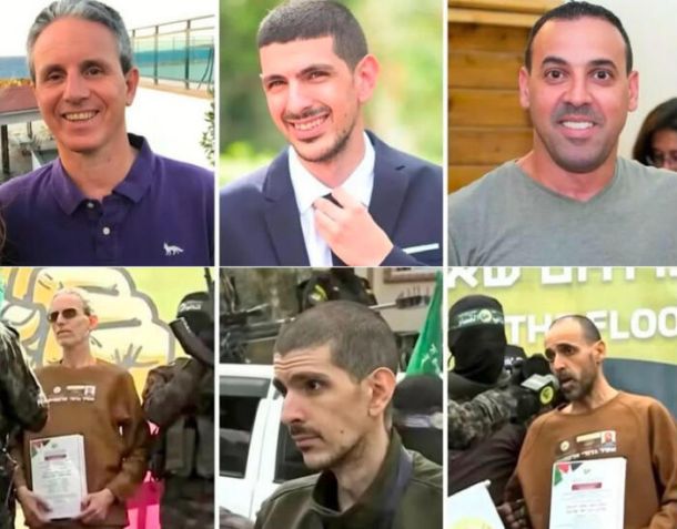 Netanyahu: “Immagini scioccanti non passeranno inosservate”. Hagar Mizrahi, funzionaria del ministero della Salute israeliano, ha dichiarato che i tre ostaggi soffrono di grave malnutrizione e hanno perso molto peso. Ohad Ben Ami, 56 anni, è stato il primo a essere portato fuori dal veicolo di Hamas, seguito da Eli Sharabi, 52 anni, eOr Levy, 34 anni. Mentre si trovavano in piedi sul palco, i tre – diversamente da come appaiono nella foto – sono apparsi visibilmente pallidi e magri dopo 16 mesi di prigionia e sono stati costretti a rilasciare dichiarazioni di propaganda.