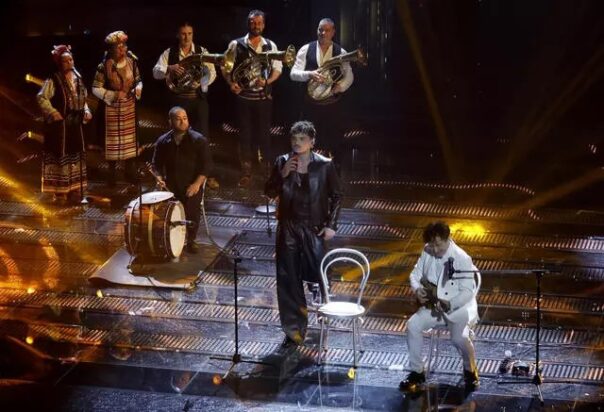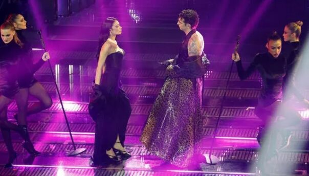 MEDLEY MAHMOOD – Decisamente più a suo agio cantando che alla conduzione, Mahmood si è esibito in un medley dei sui successi “NLDA INTRO”/”Bakugo”/”RA TA TA”/”Soldi” “Kobra”/ “Tuta gold. Pantaloni larghi rossi fuoco e torso nudo ha cantato e ballato circondato da un gruppo di ballerini in passamontagna nero, in una performance psichedelica e coinvolgente. Capelli divisi con la riga in mezzo, ma che disegnano una croce, una acconciatura decisamente sorprendente. Dopo aver cantato, Mahmood si è decisamente sciolto anche alla conduzione e nello scambio di battute e di giacche con Carlo Conti ha convinto.