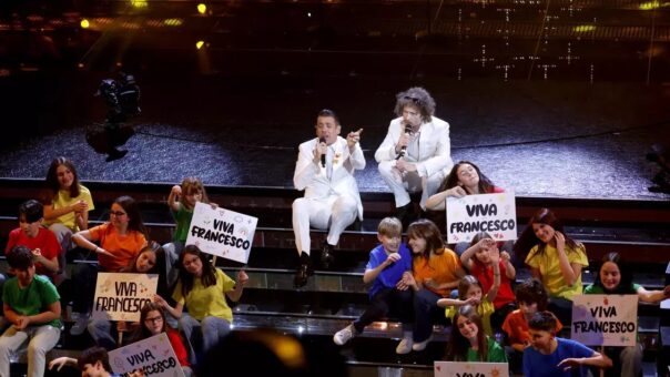 GABBANI CON TRICARICO – “Ma tu chi sei? Io sono Francesco”: “No, Francesco sono io”. Ma allora, forse, tutti siamo Francesco”. Francesco Gabbani chiama Tricarico e canta “Io sono Francesco”, un inno in difesa dei bambini che nel 2020 scatenò anche polemiche per gli insulti alla maestra nel testo e qualche censura in radio. Completo total white, Gabbani e Tricarico hanno chiamato sul palco anche alcuni bambini che hanno mostrato i cartelli con la scritta “Viva Francesco”.