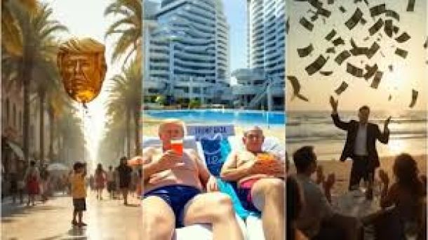 La clip raffigura una moderna Striscia con passeggiate, grattacieli e spiagge scintillanti. Ci sono danzatrici del ventre barbute, un’enorme statua dorata dello stesso Trump, le persone ballano mentre piovono banconote da un dollaro e un sosia di Elon Musk si gode un piatto di hummus. Trump balla con una donna vestita in modo succinto e, alla fine, si rilassa con un drink a bordo piscina con il premier israeliano Netanyahu.