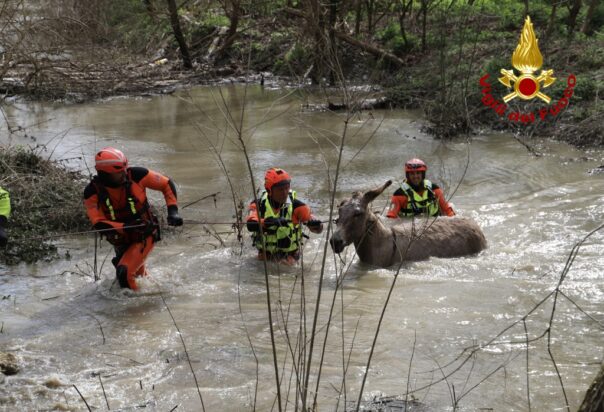 TERRANUOVA BRACCIOLINI (AREZZO) – I Vigili del fuoco del comando di Arezzo coadiuvati anche da personale SA (Soccorritori Acquatici) proveniente dalla sede di Arezzo e da personale del nucleo sommozzatori di Firenze, stanno intervenendo da stamattina, 13 marzo 2025, a Terranuova Bracciolini nel fiume Arno, a valle della diga di Levane, per soccorrere 80 asini rimasti bloccati su due isolotti formatisi a causa dell’innalzamento dell’acqua.