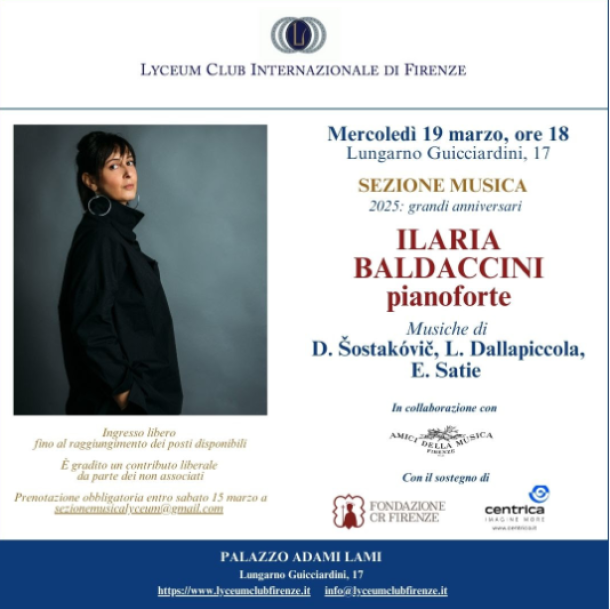FIRENZE – Mercoledì 19 marzo 2025, alle ore 18, nella sede del Lyceum in Palazzo Adami Lami (Lungarno Guicciardini, 17 – Firenze), in collaborazione con gli Amici della Musica di Firenze, la pianista Ilaria Baldaccini, raffinata specialista del repertorio novecentesco, celebrerà tre importanti anniversari musicali: il centenario della scomparsa di Erik Satie ed il cinquantenario di quelle di Luigi Dallapiccola e Dmítrij Šostakóvič.