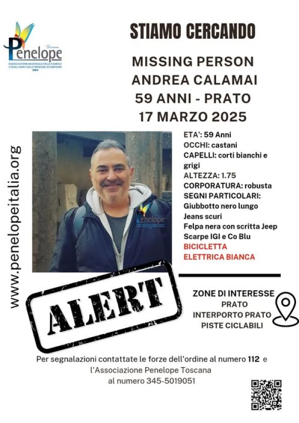 “Stiamo cercando Andrea Calamai di Prato. Lunedì è uscito dal posto di lavoro nella pausa pranzo per tornare a casa come tutti i giorni e rientrare poi al lavoro. Non è rientrato a casa né al lavoro. Usa spostarsi casa-lavoro con una bicicletta elettrica bianca. La famiglia è seriamente preoccupata. Qualcuno lo ha incontrato? Ha visto una bicicletta elettrica bianca? PER SEGNALAZIONI ASSOCIAZIONE 3455019051 o 112 di Prato.”