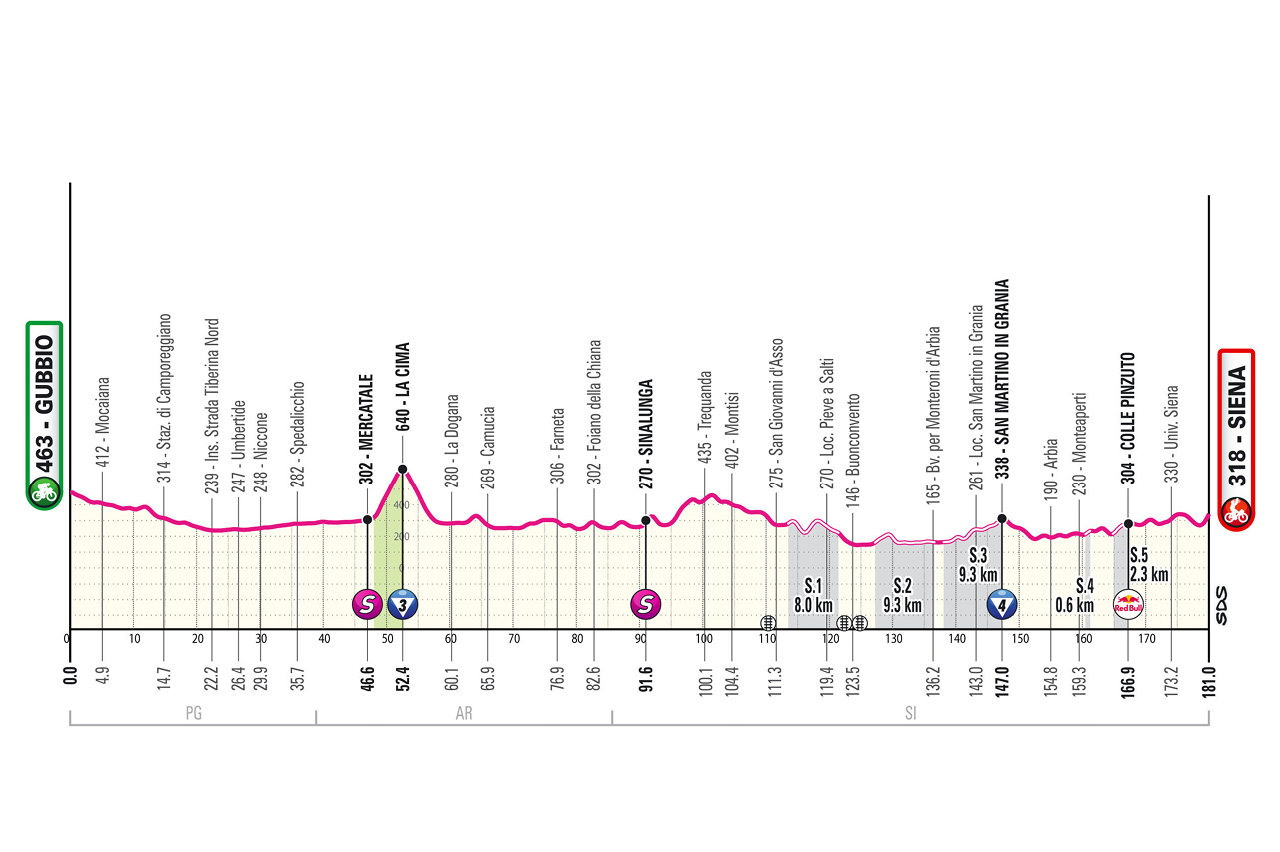 GUBBIO-SIENA DOMENICA 18 MAGGIO – Sono 181 i chilometri in programma con partenza da Gubbio alle ore 13 e un dislivello di 2.500 metri. Sono circa 30 i chilometri di strade bianche. L’arrivo a Siena sarà in Piazza del Campo dopo il pesante muro di via Santa Caterina a poche centinaia di metri dall’arrivo.