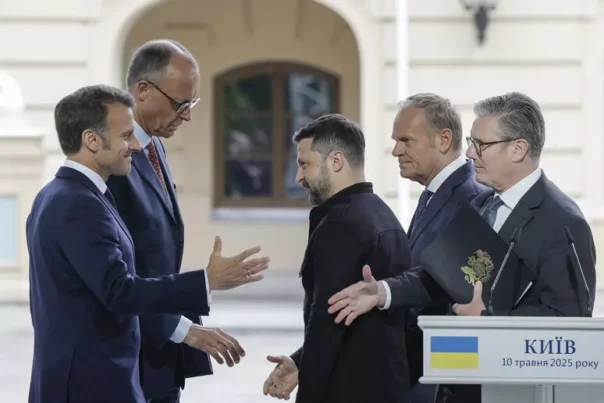 I leader di Francia, Regno Unito, Germania e Polonia si riuniscono con il presidente ucraino e tutti e cinque sentono Donald Trump. La foto del loro incontro rimbalza ovunque, come quella di Kiev.