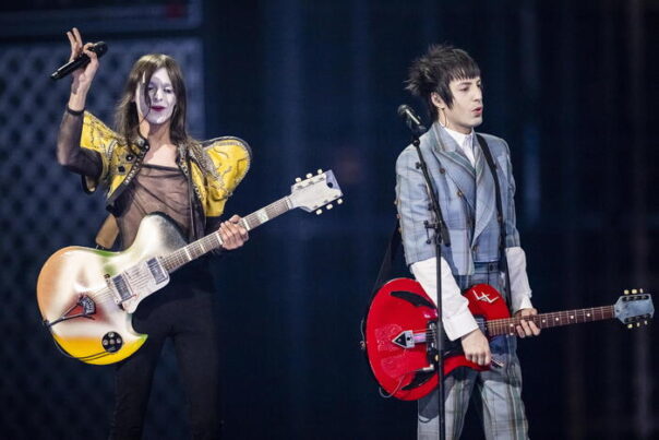 CORSI – Lucio Corsi incanta l’arena St. Jakobshalle con la sua semplicità e la sua armonica, tra lo sventolio di bandiere italiane. Accompagnato dall’inseparabile amico Tommaso Ottomano, il cantautore toscano ha presentato una performance all’altezza delle aspettative, con pianoforte, amplificatori giganti, chitarre ovali, armonica dal vivo e sottotitoli in inglese.