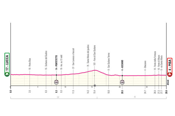 LUCCA – Giornata di riposo oggi, 19 maggio, per il Giro d’Italia 2025 che riparte domani, martedì 20 maggio, con la decima tappa, una cronometro individuale di 28,6 chilometri complessivi tutta in Toscana, la Lucca-Pisa. Rilievi a Pontetto (Km. 8,3) e Asciano (20,5) di un appuntamento contro il tempo quasi pianeggiante, con una breve e salita a metà percorso.