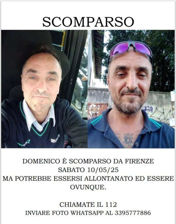 FIRENZE – Da sabato 10 maggio 2025 non si hanno più notizie di Domenico Moro, 43 anni, residente a Firenze. La famiglia dell’uomo ha lanciato un appello per le ricerche. Domenico si era allontanato da casa, zone Cure Faentina, in sella alla sua mountain bike, una bici grigia con cesto anteriore verde, per incontrare un’amica in piazza della Libertà ma all’appuntamento non è mai arrivato. Da allora il suo cellulare risulta spento.