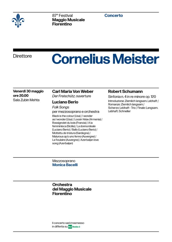 FIRENZE – Venerdì 30 maggio alle 20, per l’87º Festival del Maggio Musicale Fiorentino, il maestro Cornelius Meister alla guida dell’Orchestra del Maggio dirige l’Ouverture di Der Freischütz di Carl Maria von Weber (1821) e la Sinfonia n. 4 in re minore op. 120 di Schumann; in mezzo, la composizione che dà il nome al concerto, ossia Folk Songs di Luciano Berio, tributo al compositore a cento anni dalla nascita (24 ottobre 1925): furono composte nel 1964 per la moglie Cathy Berberian, mezzosoprano versatile dalla voce molto estesa, e sono un’antologia di undici canti popolari di varia provenienza (Stati Uniti, Armenia, Sicilia, Sardegna, Provenza, Azerbaijan) trovati in vecchi dischi e raccolte di canti popolari.