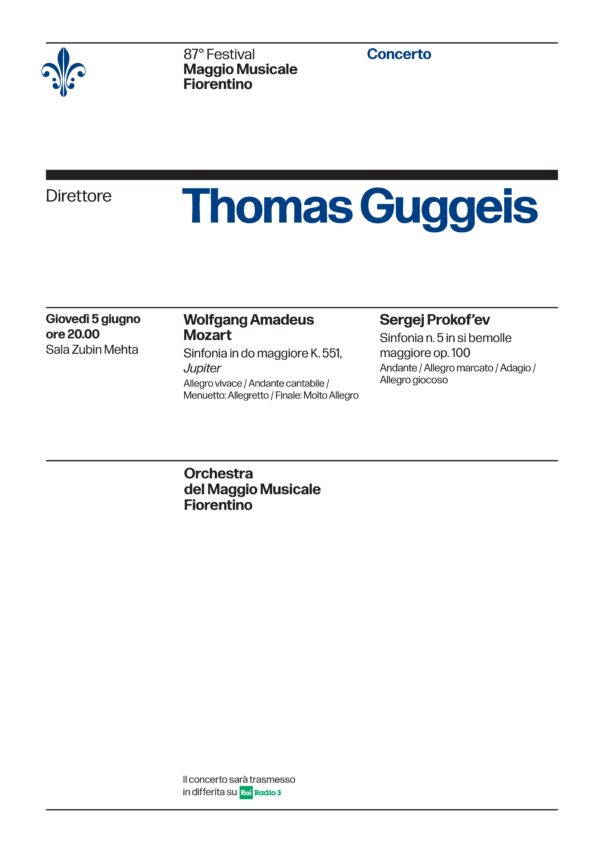FIRENZE – Per l’87° Festival del Maggio Musicale Fiorentino, arriva un altro interessante giovane direttore: Thomas Guggeis, che ha già sperimentato i maggiori palchi nazionali ed esteri; in Sala Mehta giovedì 5 giugno alle 20 dirigerà l’Orchestra del Maggio nell’ultima sinfonia del catalogo di Wolfgang Amadeus Mozart, la Sinfonia in do maggiore K. 551, detta Jupiter (1778) e la Sinfonia n. 5 in si bemolle maggiore op. 100 di Sergej Prokof’ev (1944).