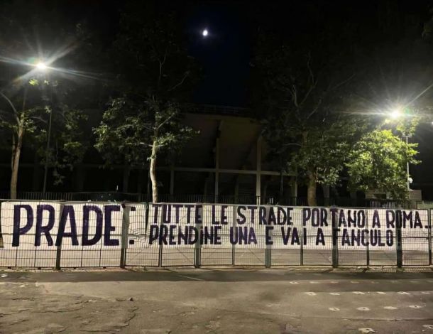 “Pradè tutte le strade portano a Roma, prendine una e vai…”, il testo dello striscione non firmato, che però è riconducibile ai gruppi della tifoseria organizzata della Curva Fiesole che ne hanno condiviso la foto sui propri canali ufficiali social.