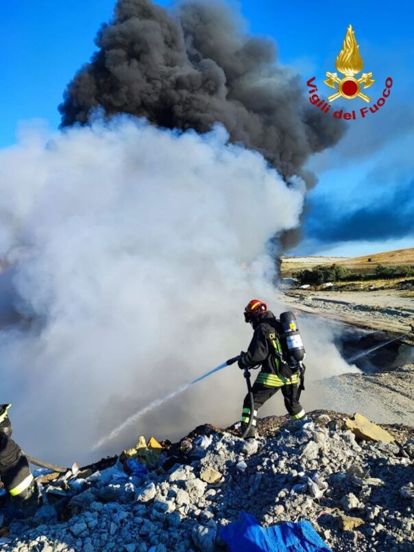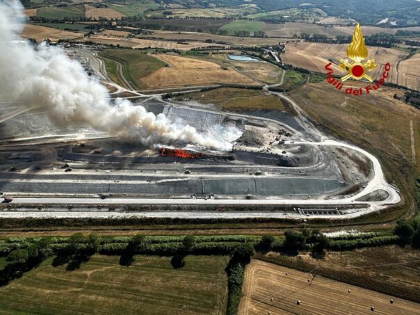 ROSIGNANO (LIVORNO) – Nuvola di fumo dalla discarica di Scapigliato per un incendio che ha reso difficile anche il transito della steada statale 206, nel comune di Rosignano Marittimo.