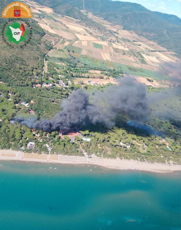 Un nuovo insidioso incendio è invece divampato da circa mezz’ora nella zona di Roccamare, a Castiglione della Pescaia. Le fiamme stanno interessando una pineta storica, con presenza di abitazioni e il campeggio Santapomata, che ospita circa 600 persone e che è stato evacuato.