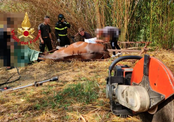 I vigili del fuoco giunti sul posto hanno atteso l’arrivo del veterinario che ha addormentato il cavallo, per poi procedere con la mototroncatrice al taglio di alcuni profili di ferro dove il quadrupede si era incastrato.