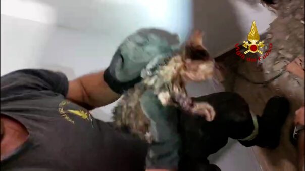 Il micino si era infilato nel tubo di sfiato per l’aerazione di un vespaio rimanendo imprigionato a testa in giù. I vigili del fuoco hanno rotto parte del muro, tagliato la tubazione corrugata e recuperato il gatto.